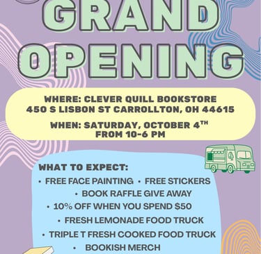 Wrenville will be available at The Clever Quill Bookstore in October of 2025! The address for this bookstore is here: 450 S Lisbon St, Carrollton, OH, United States, OH